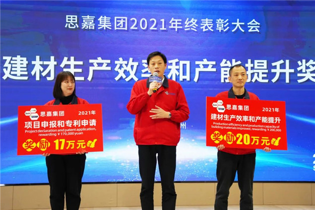 “今天為建材事業(yè)部和專利頒獎(jiǎng),我心里非常激動(dòng)。從2018年至今,建材事業(yè)部歷經(jīng)風(fēng)雨,我們從中吸取教訓(xùn)、積累經(jīng)驗(yàn),才得以讓建材產(chǎn)能突飛猛進(jìn),實(shí)現(xiàn)產(chǎn)值的飛躍。思嘉如今的發(fā)展,離不開全體思嘉人的共同努力與付出。為此,我表示衷心的感謝。未來,我們要繼續(xù)提升產(chǎn)能,推動(dòng)設(shè)備智能化改造,提高項(xiàng)目研發(fā)能力,致力于成為行業(yè)的領(lǐng)軍人物,為思嘉集團(tuán)十四五期間100億的銷售額繼續(xù)做出更大的努力。”思嘉建材事業(yè)部總經(jīng)理劉俊在頒獎(jiǎng)致辭中說道。